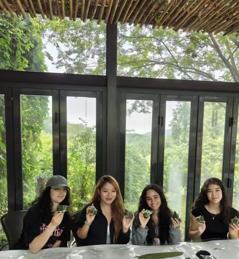 随后,国际师生来到坡上村,共同包粽子,庆端午。活动现场,大家认真学习包棕子的技巧,从选材、折叠粽叶到填充糯米、捆绑成型,虽然手法略显生疏,但热情高涨,现场充满欢声笑语。通过亲手包粽子,国际师生们不仅体验了中国传统节日的习俗,还加深了对中国文化的理解和喜爱。粽子包好后,大家围坐在一起,品尝着自己亲手制作的粽子,感受着端午节的温馨氛围。